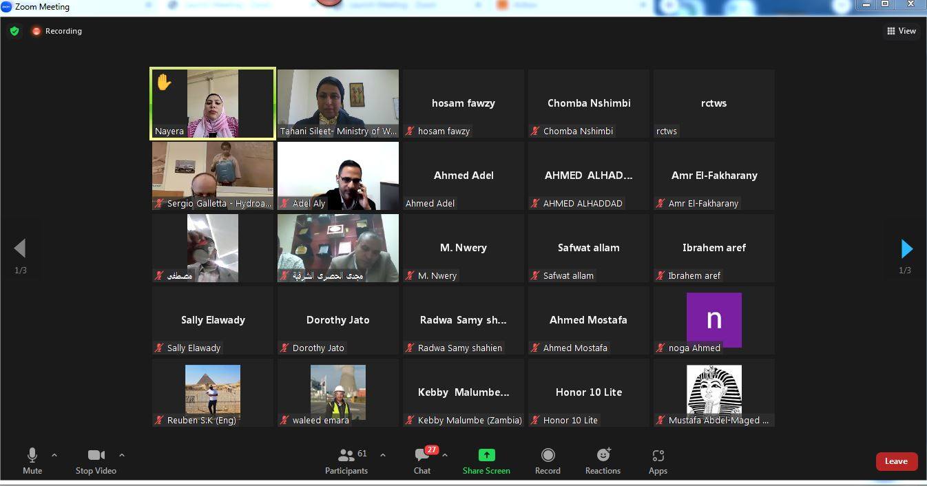 A virtual training course was held under the title "Water Management for Non-Agricultural Purposes in Urban Areas" with the participation of 24 African trainees who were nominated by the Secretariat of the African Ministers of Water Council AMCOW from the countries (Democratic Congo - Tanzania - Tunisia - Benin - Cameroon - Gambia - Zambia), In addition to 50 trainees from Egypt from the ministries of (irrigation, environment, housing and electricity), which are organized in cooperation between the Ministry of Water Resources and Irrigation and the Italian University of Turin, as of May 2, 2023 for a period of 5 weeks.